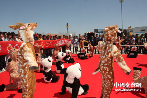 今天的威海機(jī)場喜氣洋洋,彩旗飄飛,在機(jī)場大門至機(jī)坪入口設(shè)置了3個(gè)大型拱門,沿途兩側(cè)設(shè)置了彩色道旗,中央電視臺、山東衛(wèi)視和齊魯電視臺、威海電視臺現(xiàn)場直播盛況,大家熱情迎接來自寶島臺灣的一對長鬃山羊“喜羊羊”和“樂羊羊”,和一對梅花鹿“繁星”和“點(diǎn)點(diǎn)”。機(jī)場里有100名人員持手旗、橫幅歡迎寶島的梅花鹿和長鬃山羊來威海安家,24名來自威海鯨園小學(xué)二、三年級的小學(xué)生穿著長鬃山羊、梅花鹿、大熊貓樣式的服裝表演舞蹈。(記者 李杰 劉海偉 董憲超)