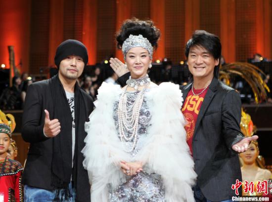 宋祖英2011臺(tái)北小巨蛋演唱會(huì)將于8日母親節(jié)晚間正式登場。圖為主辦方7日舉行彩排記者會(huì),宋祖英(左2)與周華。ㄓ2)周杰倫(左1),以及演唱會(huì)主持人徐乃麟(右1)齊亮相。路梅 攝