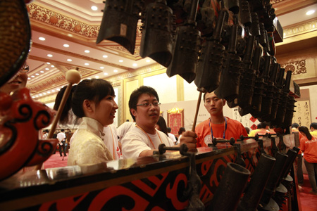 兩岸青年參觀中華非物質(zhì)文化遺產(chǎn)編鐘展示并親自體驗(yàn)(中國(guó)臺(tái)灣網(wǎng) 普燕 攝)