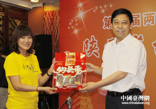陜西省臺辦主任閆超英向志工代表贈送陜西特產(陜西省臺辦 張群莉 攝)