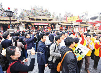 陸客倍增,擠滿臺灣朝天宮廣場,帶動臺灣華語導游需求,臺灣民眾報考導游證考試的考生也大幅增長。(圖片來源于:臺灣《聯合報》)