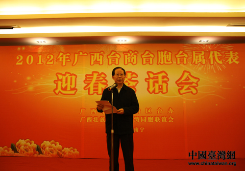 中國臺灣網1月6日南寧消息 1月5日,2012年廣西臺商臺胞臺屬代表迎春茶話會在南寧舉行。自治區領導和有關部門負責人與全區100多位臺商臺胞臺屬臺生代表歡聚一堂,共敘親情友情,喜迎新春。