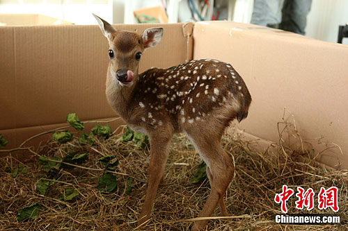 2011年11月4日是臺灣贈送大陸的梅花鹿“點點”所生的小公主降生山東威海劉公島國家森林公園的第10天,小鹿正在健康成長。中新社發 蔡潤連 攝