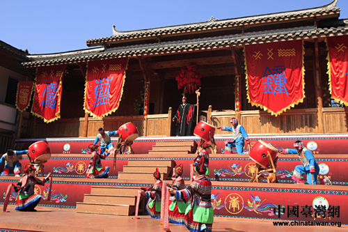 “各位山外貴客,今日是我畬鄉(xiāng)藍(lán)姓少女選郎君出嫁的吉日!弊彘L的一句話拉開了族婚俗表演的序幕。數(shù)位身著極富民族特色傳統(tǒng)服裝的畬族男女載歌載舞,用歡快的歌聲和曼妙的舞姿歡迎著遠(yuǎn)道而來的貴客。隨后,四位來自臺(tái)灣的少數(shù)民族代表分別被邀請(qǐng)擔(dān)當(dāng)“新郎”、“赤郎”(伴郎)、“親家舅”,與畬族表演者共同完成畬族的特色婚禮。在傳統(tǒng)婚俗表演中,“新郎”要過五關(guān)斬六將,闖過“新娘”一方設(shè)置的重重難關(guān),才能夠最終迎娶“新娘”。