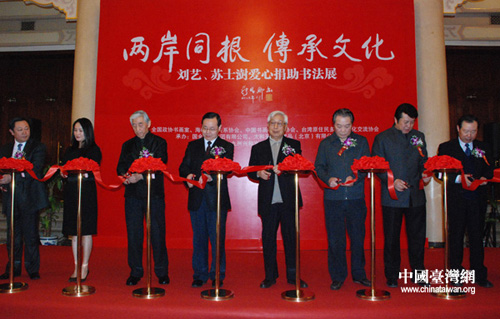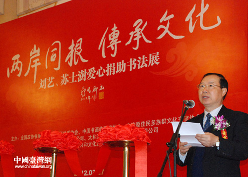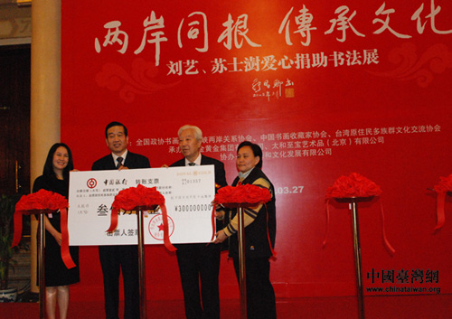 中國臺灣網3月28日北京消息 由全國政協書畫室、中國書畫收藏家協會主辦的“兩岸同根,傳承文化——劉藝、蘇士澍愛心捐助書法展”昨日上午在全國政協禮堂隆重舉行。活動共展出劉藝、蘇士澍兩位當代著名書法家作品80余幅。同時,兩位名家還當場向臺灣省花蓮縣秀林鄉捐贈人民幣300萬元籌建“愛心圖書館”。原全國政協副主席、政協書畫室主任張思卿,海峽兩岸關系協會副會長王在希,臺灣地區少數民族民意代表高金素梅等出席活動。