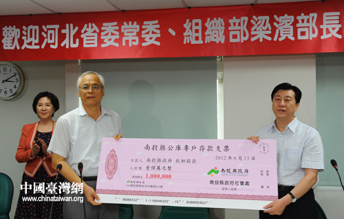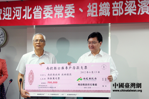 6月13日,河北省委常委、組織部部長梁濱在南投縣捐款100萬人民幣用于賑災(zāi)。(中國臺灣網(wǎng) 馬迪 攝)