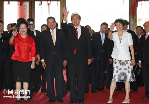 海基會董事長江丙坤夫婦在臺北圓山飯店一樓大堂迎接海協會會長陳云林夫婦。 中國臺灣網發