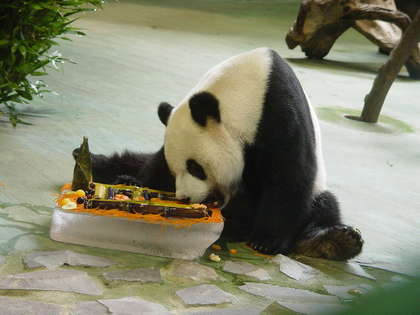 今年也不例外,等待小兩口的是蛋糕大餐,“圓圓”的蛋糕上鋪滿了餅干屑以及它十分愛吃的蘋果、紅蘿卜、葡萄、西瓜等,“團團”的蛋糕冰塊上則是鋪上了紅蘿卜絲,水果比“圓圓”的多了甘蔗。(中國臺灣網 李帥)