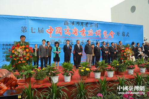 中國臺灣網10月16日聊城消息 日前,海峽兩岸書畫情——第七屆中國(高唐)書畫博覽會暨李奇茂美術館開館儀式在聊城高唐舉行。山東省委常委、統戰部長顏世元,中國國民黨副主席蔣孝嚴,國民黨中央評議委員、兩岸文化藝術交流小組主任、中華兩岸文化藝術基金會會長莊漢生,臺灣著名畫家、中華文化海峽兩岸交流協會榮譽會長李奇茂,國臺辦交流局副局長曲萌,山東省臺辦主任張雪燕,聊城市委書記宋遠方,市委常委、高唐縣委書記劉春華等參加了開幕式。