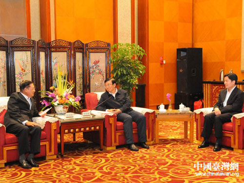 四川省委副書記李春城(中)、副省長甘霖(右)會見江丙坤(左)。圖片來源:四川省臺辦
