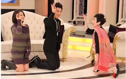 張曉龍(中)8日教張小燕(右)古代禮儀,讓小燕難得在節目中“下跪”。圖自臺媒