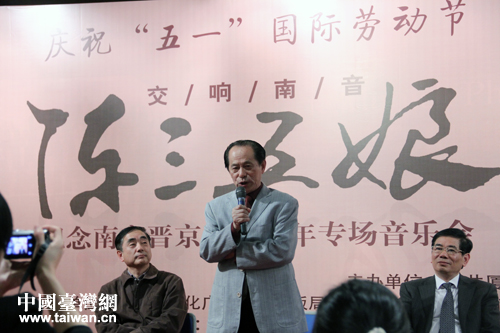交響南音《陳三五娘》專場音樂會將于28日晚7時30分在國家大劇院音樂廳上演。圖為著名作曲家、上海音樂學院教授何占豪在25日下午舉行的記者會上介紹創作心得。(中國臺灣網 楊麗 攝)