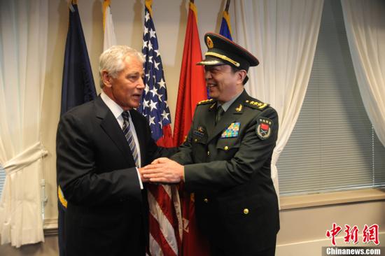 華盛頓時間8月19日,正在美國進行正式友好訪問的中國國務委員兼國防部長常萬全(右)與美國國防部長哈格爾在華盛頓五角大樓舉行會談前相談甚歡。中新社發 吳慶才 攝