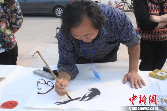 9月29日,海峽兩岸150余名書畫家和書畫愛好者在李苦禪藝術(shù)館前共同創(chuàng)作百米書畫長卷,表達對美好生活的熱愛,迎接即將到來的第十屆中國藝術(shù)節(jié)。圖為,臺灣水墨畫大師李奇茂創(chuàng)作書法作品。 楊曉衛(wèi) 攝