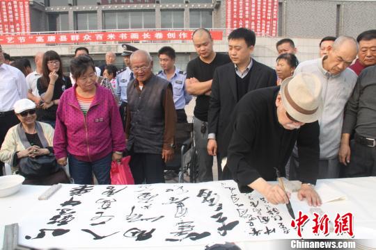 9月29日,海峽兩岸150余名書畫家和書畫愛好者在李苦禪藝術(shù)館前共同創(chuàng)作百米書畫長卷,表達對美好生活的熱愛,迎接即將到來的第十屆中國藝術(shù)節(jié)。圖為百米書畫長卷創(chuàng)作活動現(xiàn)場。 楊曉衛(wèi) 攝