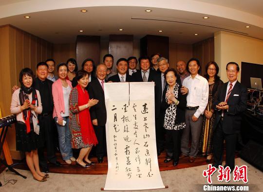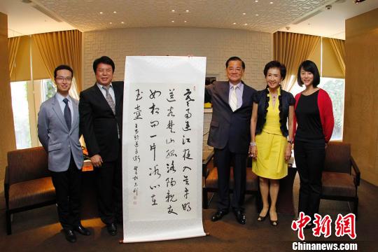 覃志剛向中國國民黨榮譽主席連戰贈送書法藝術作品。 寶勝 攝