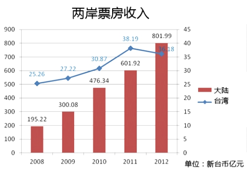消息說,兩岸軟實力抬頭,兩岸不約而同地將文化創意產業列為未來十年的重點發展產業,其中大陸在電影產業的成長進入高速發展期。2012年已經超越日本,成為全球第二大票房地,全年票房達新臺幣801.99億元(約27億美元)。