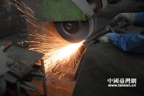 吳師傅在剛制好的鋼刀上刻出“萬里海疆巡禮·金門”字樣。(李建偉 攝)