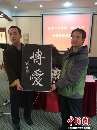 孫中山紀念館向輔仁大學贈送了孫中山先生手書“博愛"二字的拓片!∩耆健z