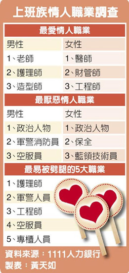 據臺灣媒體報道,前日是七夕情人節,究竟島內男、女性上班族最愛及最厭惡的情人職業是什么呢?根據臺灣人力銀行最新調查,男、女性上班族最愛的情人職業與過去改變不大,倒是最厭惡的情人職業,竟不約而同都是政治人物,原因是政治人物沒有上下班,更沒有隱私,不利戀情發展。