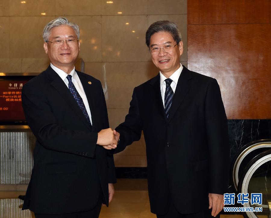 10月13日,國臺辦主任張志軍(右)在賓館迎接臺灣方面陸委會主委夏立言。10月13日,臺灣方面陸委會主委夏立言率團(tuán)抵達(dá)廣州白云機(jī)場,國臺辦副主任陳元豐前往機(jī)場迎接。14日上午,國臺辦主任張志軍將與夏立言在廣州舉行兩岸事務(wù)主管部門負(fù)責(zé)人工作會面。新華社記者陳曄華攝