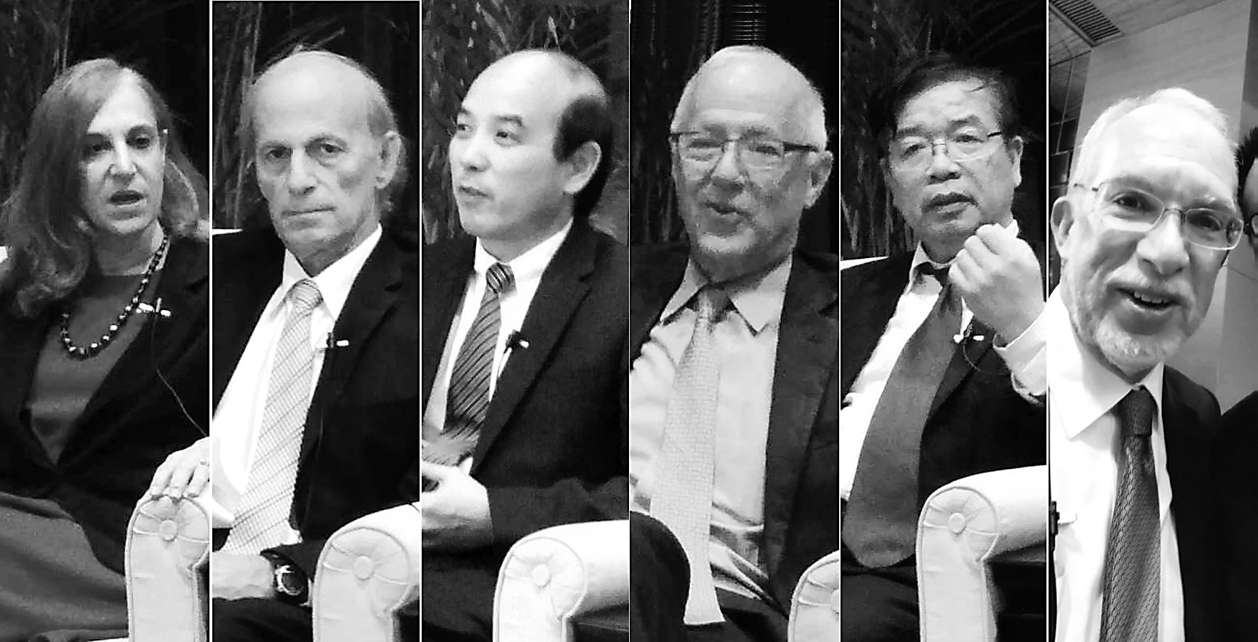 自左至右:美國國際戰略研究中心高級顧問葛來儀、布魯金斯學會高級 研究員杰弗里·貝德、中國現代國際關系研究院副院長袁鵬、美中關系全國 委員會會長斯蒂芬·歐倫斯、上海社會科學院副院長黃仁偉、布魯金斯學會 高級研究員埃文斯·李維亞。