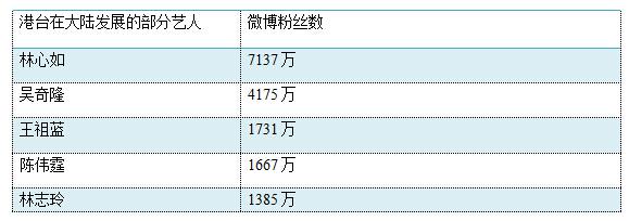 港臺在大陸發展的部分藝人新浪微博粉絲數統計