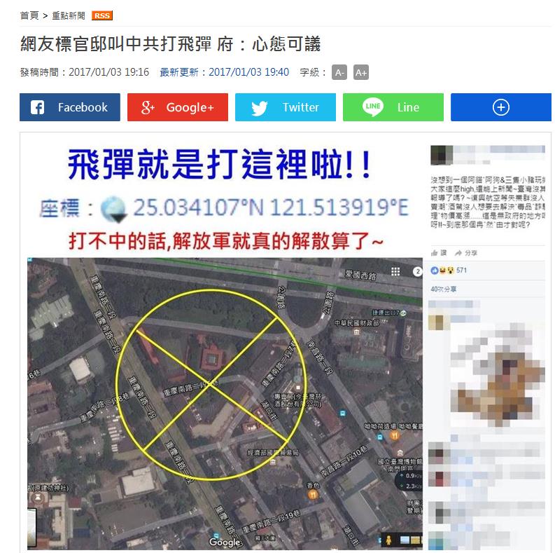 報道稱,有網友在臉書成立社團,甚至直接放上Google地圖,畫面清楚標示總統官邸的座標,且向對岸放話,要中國大陸的導彈往這個座標打,甚至嗆聲“打不中的話,解放軍就真的解散算了”。