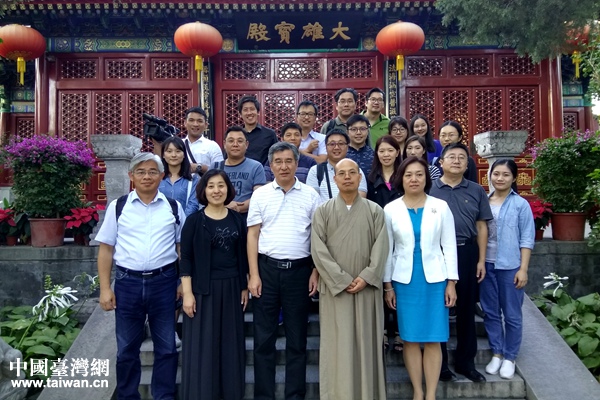 《北京法源寺》參會(huì)人員與寺內(nèi)法師殿前合影。(中國臺(tái)灣網(wǎng)發(fā) 北京市臺(tái)辦提供)