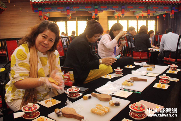 臺商參訪團在老舍茶館體驗做月餅(中國臺灣網 孫伊靜 攝)