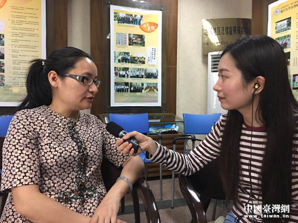 廈門大學(xué)臺(tái)灣研究院兩岸關(guān)系研究所所長張寶蓉(左)接受記者李金鑫采訪。
