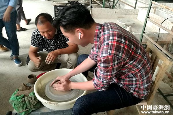 臺灣TVBS電視臺記者高嘉甫現場體驗牙舟陶制作過程。(中國臺灣網 張亞靜 攝)