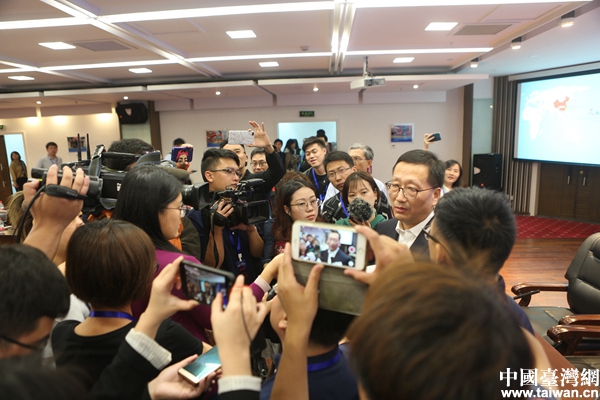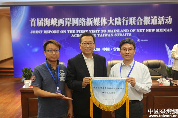 寧波舟山港董事會(huì)秘書蔣偉與兩岸記者代表合影。(中國臺(tái)灣網(wǎng) 陳佳慧 攝)