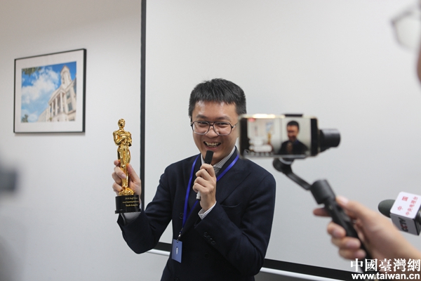 寧波諾丁漢大學(xué)臺(tái)灣講師林岳龍展示自己獲得的優(yōu)秀教師獎(jiǎng)。(中國臺(tái)灣網(wǎng) 陳佳慧 攝)
