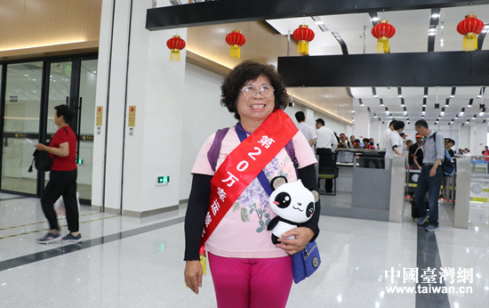 來自臺中的劉細妹是玉環市大麥嶼港對臺直航第20萬人次幸運旅客。(中國臺灣網 普燕 攝)