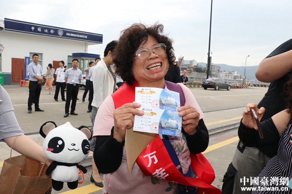 玉環市大麥嶼港對臺海上直航第20萬人次幸運旅客劉細妹獲贈“中遠之星”往返船票一套。(中國臺灣網 普燕 攝)