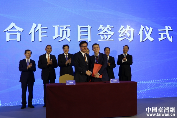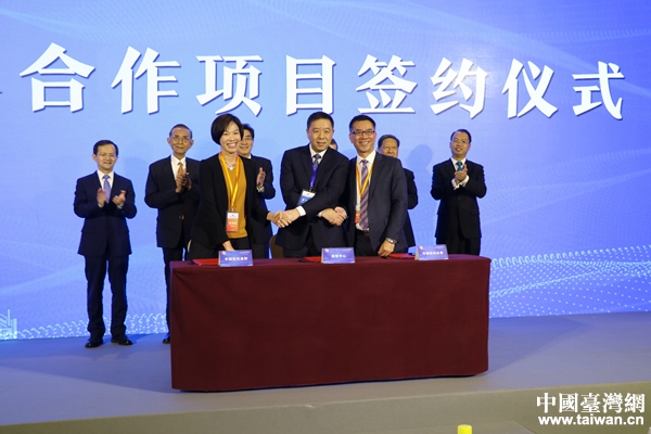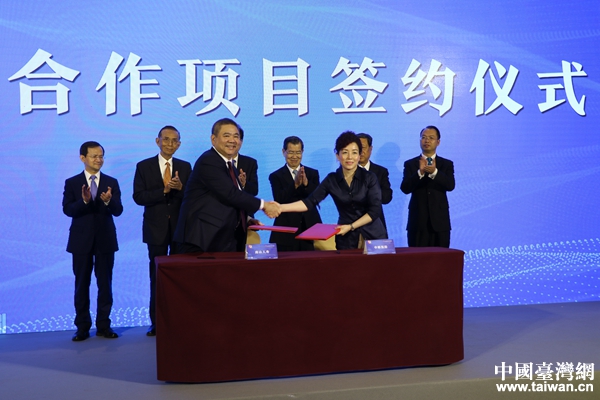 已達成合作協議的兩岸金融、保險及高新技術企業在簽約儀式上進行簽約,正式開展合作。(完)