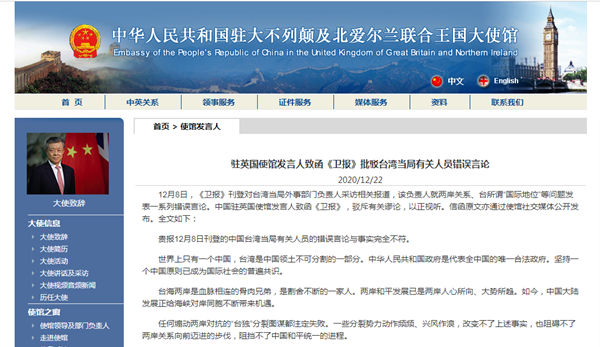 中國臺灣網(wǎng)12月23日訊 據(jù)中國駐英國大使館22日發(fā)布消息,英國《衛(wèi)報》8日刊登對臺外事部門負(fù)責(zé)人采訪相關(guān)報道,該負(fù)責(zé)人就兩岸關(guān)系、臺所謂“國際地位”等問題發(fā)表一系列錯誤言論。中國駐英國使館發(fā)言人致函《衛(wèi)報》,駁斥有關(guān)謬論,以正視聽。信函原文亦通過使館社交媒體公開發(fā)布。