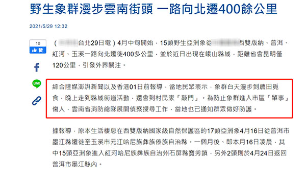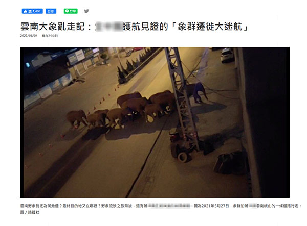“中時新聞網”自5月底就開始關注,并陸續發布多篇文章,還將此次野象的“北遷”之旅稱為“長征”,從野象群的遷徙路線,當地政府保護舉措,專家觀點,包括野象群發生的見聞趣事均做了詳細報道。