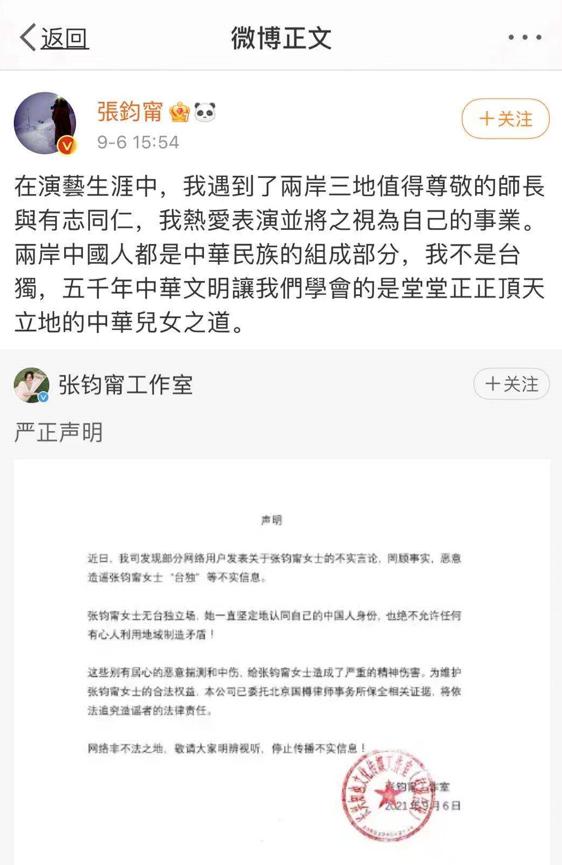 隨后,張鈞甯也轉發工作室微博再次重申:“在演藝生涯中,我遇到了兩岸三地值得尊敬的師長與有志同仁,我熱愛表演并將之視為自己的事業。兩岸中國人都是中華民族的組成部分,我不是‘臺獨’,五千年中華文明讓我們學會的是堂堂正正頂天立地的中華兒女之道。”(完)