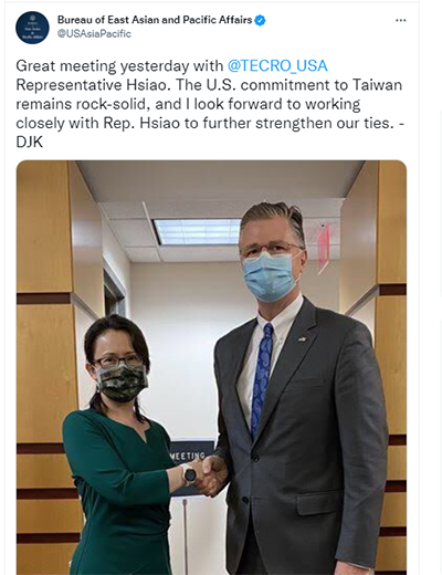 美國國務(wù)院有關(guān)社交媒體賬號高調(diào)發(fā)布副國務(wù)卿費(fèi)爾南德斯、亞太事務(wù)助卿康達(dá)與蕭美琴見面的照片及貼文。(美國國務(wù)院有關(guān)社交媒體賬號截圖)
