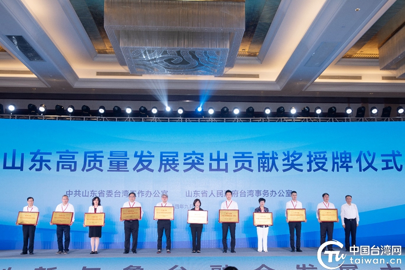 產業創新與魯臺融合發展大會上,20位在魯臺資企業、創業臺青代表獲頒“助力山東高質量發展突出貢獻獎”紀念牌。(中國臺灣網記者 陳佳慧 攝)