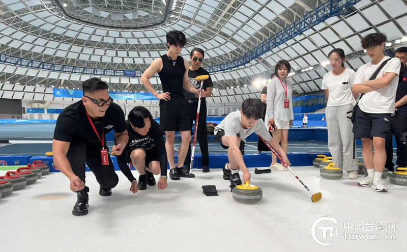 臺灣青年自媒體博主向運動員學習冰壺發球姿勢。(中國臺灣網記者 劉琳 攝)