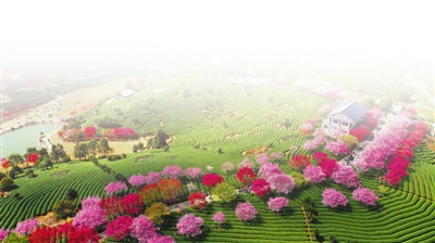 圖為2021年2月17日,游客在福建省龍巖市漳平市永福鎮臺灣農民創業園臺品櫻花茶園觀賞櫻花。