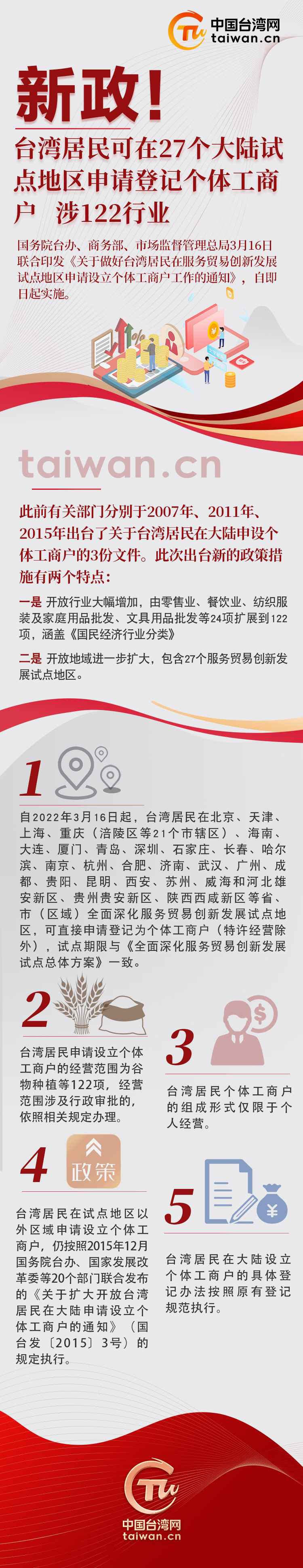 【圖解】新政!臺灣居民可在27個大陸試點地區(qū)申請登記個體工商戶 涉122行業(yè)