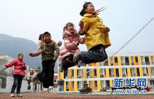 汶川縣映秀小學的曾國露(右一)與同學們在操場上玩耍(4月1日攝)。據了解,新的映秀小學在鋼筋混凝土的基礎上,還增加橡膠隔震支座、消能減震器和輕型隔斷,足以抗擊破壞力為9度的地震。 (新華社記者 陳凱 攝)
