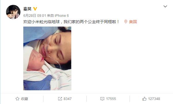 6月28日,演員秦昊在微博中貼出一張妻子伊能靜與剛出生的女兒的合照,宣告家中迎來了新成員,“歡迎小米粒光臨地球,我們家的兩個公主終于同框啦!”,而剛剛順利產女的伊能靜也轉發微博并自稱是“哭得比小米粒皺的傻媽”。