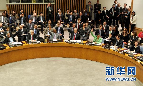 3月17日,在美國紐約聯合國總部,部分安理會理事國代表舉手投贊成票。當日,聯合國安理會通過決議,決定在利比亞設立禁飛區。新華社記者申宏攝
