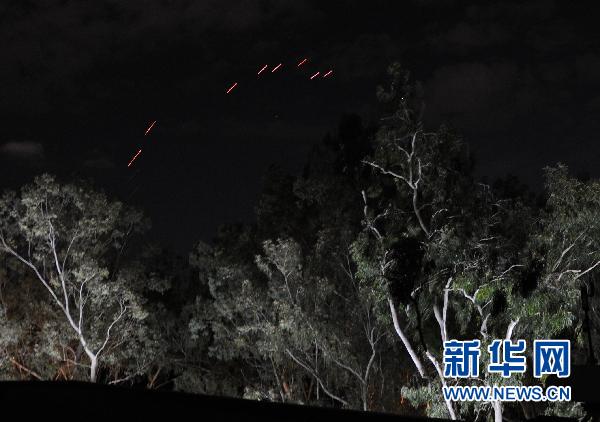 這是3月22日晚在利比亞首都的黎波里拍攝的橘紅色的防空炮火。的黎波里市區(qū)當(dāng)?shù)貢r(shí)間22日晚8時(shí)30分(北京時(shí)間23日凌晨2時(shí)30分)左右,又響起密集的防空炮聲,人們可看到橘紅色的防空炮火射向天空。 新華社記者 楊光 攝