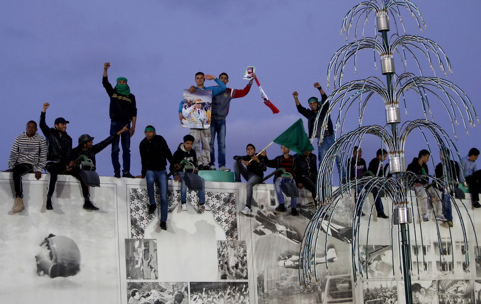 2011年3月19日,利比亞首都的黎波里,總統卡扎菲的支持者在卡扎菲官邸組成人肉盾牌防止多國聯軍轟炸。